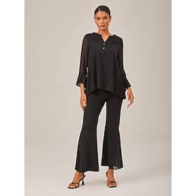 Season:Summer,Spring; Fabric:Rayon; Sleeve Length:Long Sleeve; Look After Me:Machine wash; Gender:Women’s; Style:Elegant,Daily; Elasticity:Inelastic; Occasion:Formal,Office / Career,Wedding,Party,Event / Party; Details:Without Pockets; Waistline:High Waist; Pattern:Solid Color; Design:Ruched,Pleated,Buttons,Splice,Irregular Hem; Neckline:V Neck; Sleeve Type:Illusion Sleeve,Flared Sleeve; Trends:Elegant,Party; Brand:Ador; Pants Type:Flare; Listing Date:04/25/2025; Print Type:non-printing – Black Contrast Design Pleated Fabric Set Shop, Clothing, Matching Sets