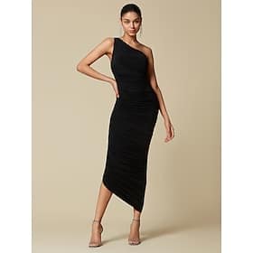Black Elegant Party/Wedding Guest Ruched Sleeveless One Shoulder Elegant Midi Dress dress to impress 2024 > Women’s > Women’s Clothing > Dresses > Party Dresses