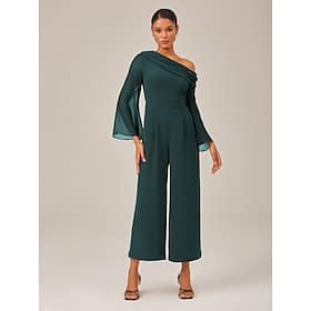 Category:Jumpsuit; Season:Summer; Fabric:Chiffon; Sleeve Length:Long Sleeve; Look After Me:Machine wash; Gender:Female; Style:Casual,Elegant; Elasticity:Inelastic; Occasion:Party / Evening,Formal,Wedding,Party,Event / Party; Fit Type:Regular Fit; Waistline:High Waist; Pattern:Solid; Design:Tunic; Neckline:Slash Neck; Sleeve Type:Illusion Sleeve,Flare Cuff Sleeve; Trends:Modern,Elegant,Party,Wide-legged; Brand:Ador; Pants Type:Wide Leg; Jumpsuit Type:Jumpsuit; Listing Date:04/25/2025; Looseness:Regular Fit; Fabric Properties:WhisperFlow Chiffon – Weightless and flowy, adding a hint of airy elegance to your look. – Draped Asymmetric Shoulder Elegant Black Jumpsuit Shop, Clothing, Jumpsuits, Jumpsuits