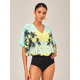 Season:Summer; Fabric:Chiffon; Sleeve Length:Short Sleeve; Look After Me:Machine wash; Gender:Female; Style:Casual,Resort; Elasticity:Inelastic; Occasion:Casual,Beach Vacation Wear; Fit Type:Regular Fit; Waistline:High Waist; Pattern:Palm Tree; Design:V Neck; Neckline:V Neck; Trends:Loose; Brand:Ador; Pants Type:Playsuit; Jumpsuit Type:Playsuit; Listing Date:04/18/2025; Looseness:Loose Fit; Fabric Properties:WhisperFlow Chiffon – Weightless and flowy, adding a hint of airy elegance to your look. – Gradient Palm Tree Print Casual Beach Bodysuit Vacation Style Shop, Clothing, Jumpsuits, Rompers