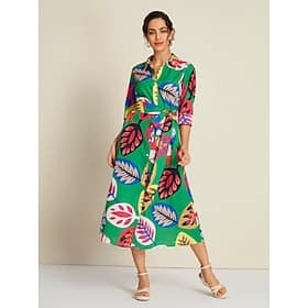 Leaf Collared 3/4 Length Sleeve Midi Shirt Dress > Shop > Clothing > Dresses > Print Dresses