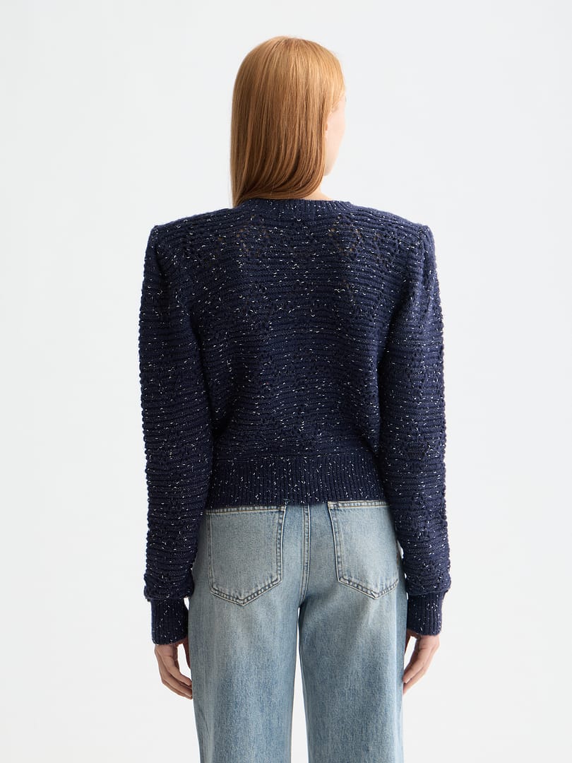 A crew neck cardigan with a subtle metallic finish and exaggerated shoulders, a piece that will elevate any look.
