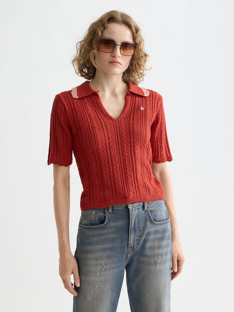 This knit polo features delicate pointelle texture and a classic collar, balancing softness with structure.