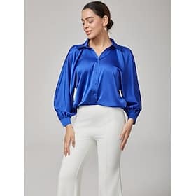 Season:Summer,Spring; Fabric:Polyester; Sleeve Length:Short Sleeve; Look After Me:Machine wash; Gender:Women’s,Female; Style:Elegant; Elasticity:Inelastic; Tops Type:Casual Shirt,Button Down Shirt; Occasion:Casual; Design:Buttons; Neckline:Shirt Collar; Sleeve Type:T-shirt Sleeve; Brand:Ador; Listing Date:08/01/2025 – Sapphire Blue Dolman Sleeve Blouse Shop, Clothing, Tops, Blouses