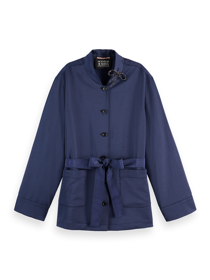 A satin blazer with a refined tailored silhouette, finished with a beaded bow at the collar for a distinctive, elevated look.