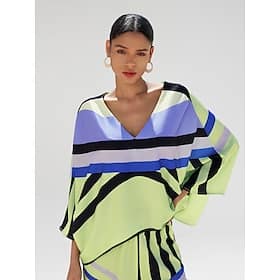 Season:Spring Summer; Fabric:Satin; Sleeve Length:3/4-Length Sleeve; Look After Me:Machine wash; Gender:Women’s; Style:Beach; Elasticity:Inelastic; Tops Type:Matching Tops,Poncho Shirts; Occasion:Daily Wear,Vacation; Details:Only tops; Waistline:No Waist; Pattern:Plaid / Striped / Chevron / Round; Design:Chandelier,Print,Geometrical; Neckline:V Neck; Sleeve Type:Magyar Sleeve; Trends:Print,Loose,Breathable; Brand:Ador; Listing Date:05/17/2024; Bust:; Length:; Sleeve:; Fit US Size:; Fit UK Size:; Fit FR Size:; Fit DE Size:; Looseness:Loose Fit; Fabric Properties:LuxeSatin – Discover the essence of quiet luxury in our exclusive Subtly Glossy Luxe Satin, it is drapey and sleek like silk. – Satin V Neck Geometric Print Poncho Blouse Shop, Clothing, Tops, Blouses