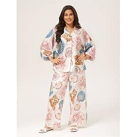 Season:Summer; Fabric:Satin; Sleeve Length:Long Sleeve; Look After Me:Machine wash; Gender:Women’s,Female; Style:Vacation,Bohemia,Elegant; Elasticity:Inelastic; Tops Type:Casual Shirt; Occasion:Casual,Beach Vacation Wear; Pattern:Ocean,Sea Creatures; Design:Print,Graphic; Neckline:Shirt Collar; Sleeve Type:Bishop Sleeve; Brand:Ador; Listing Date:05/15/2025; Looseness:Loose Fit – Shell Print Relaxed Fit Vacation Set Shop, Clothing, Matching Sets