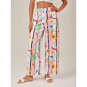 Season:Summer; Fabric:Satin; Look After Me:Machine wash; Gender:Women’s,Female; Style:Vacation,Casual,Bohemia,Elegant; Elasticity:Inelastic; Occasion:Casual,Beach Vacation Wear; Fit Type:Relaxed Fit; Waistline:High Waist; Pattern:Leaf,Tree,Animal,Graphic; Design:Printing,Oversized; Trends:Print,Boho; Brand:Ador; Pants Type:Loose,Culottes Wide Leg; Listing Date:04/21/2025; Pants Length:Full Length; Print Type:Other Prints; Looseness:Loose Fit; Fabric Properties:LuxeSatin – Discover the essence of quiet luxury in our exclusive Subtly Glossy Luxe Satin, it is drapey and sleek like silk. – Tropical Print Wide-Leg Pants Shop, Clothing, Pants & Shorts