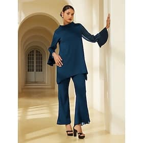 Women's Navy Blue Chiffon Modal Matching Set Blouse Bell Bottom Pants Elegant Stylish Comfortable Daily Work Evening Wear Fall > Shop > Clothing > Matching Sets